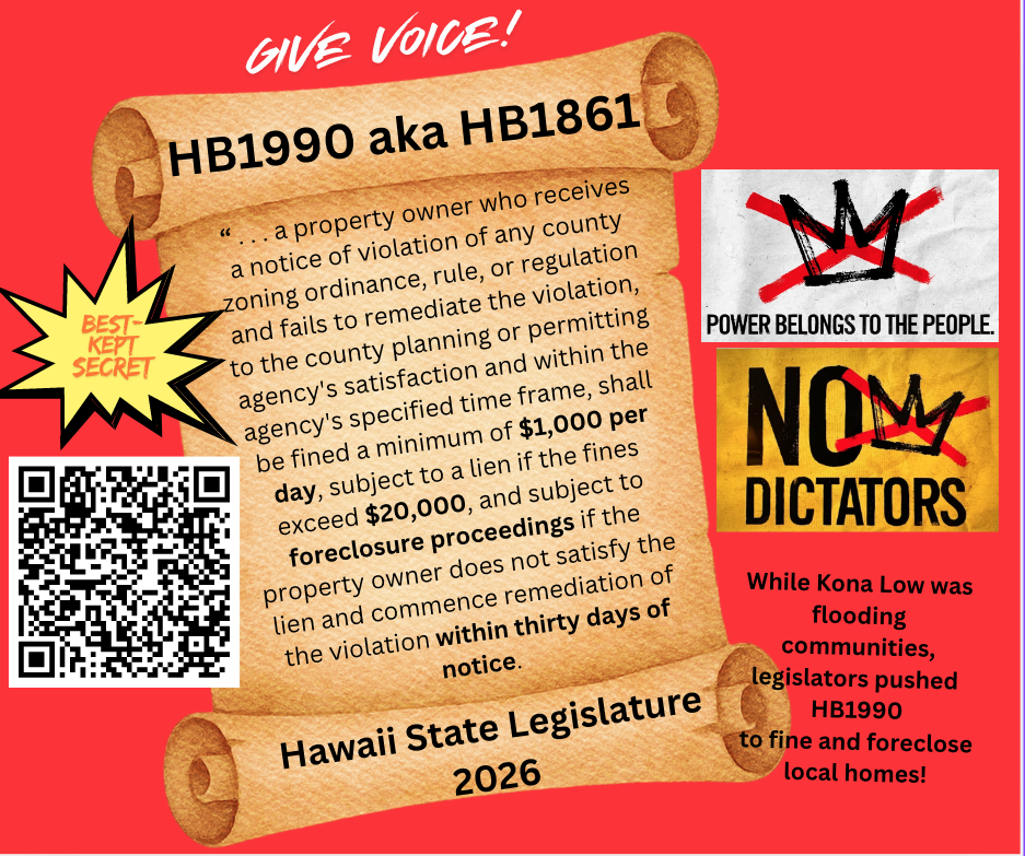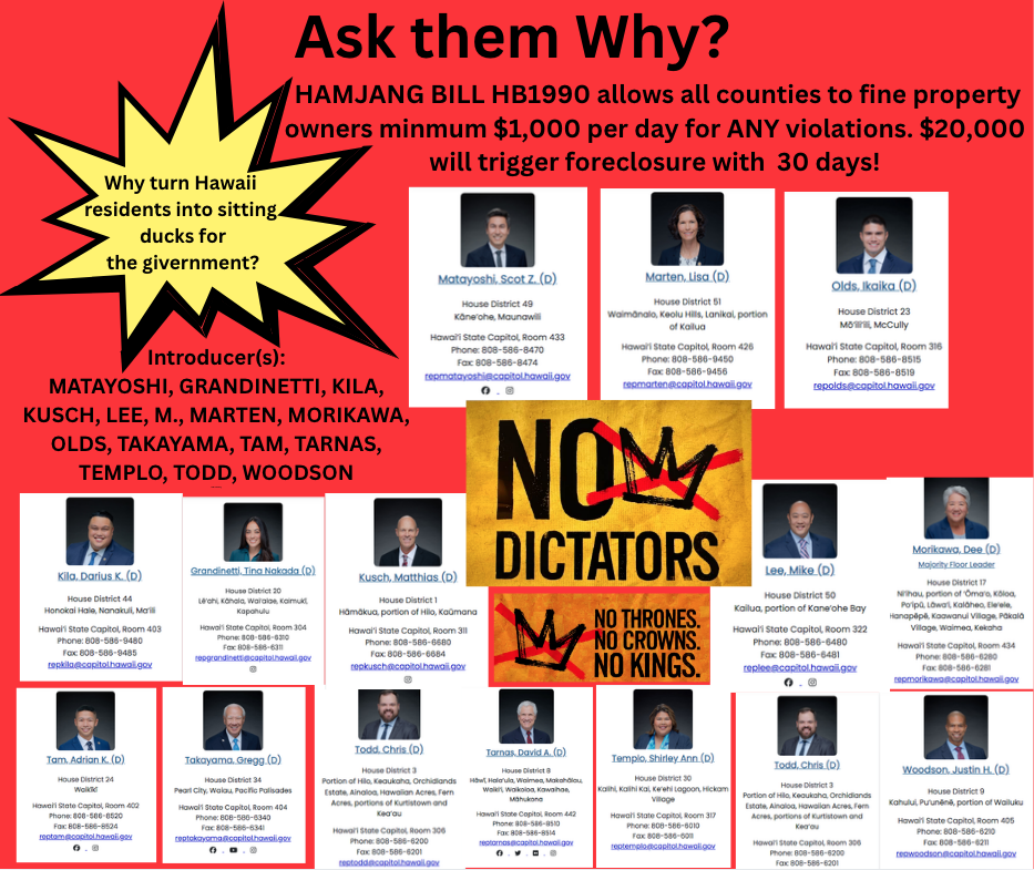 But the Hawaii State Legislature HB1990 to fine residents $1000 a day and quick foreclosure is secretly sailing through.