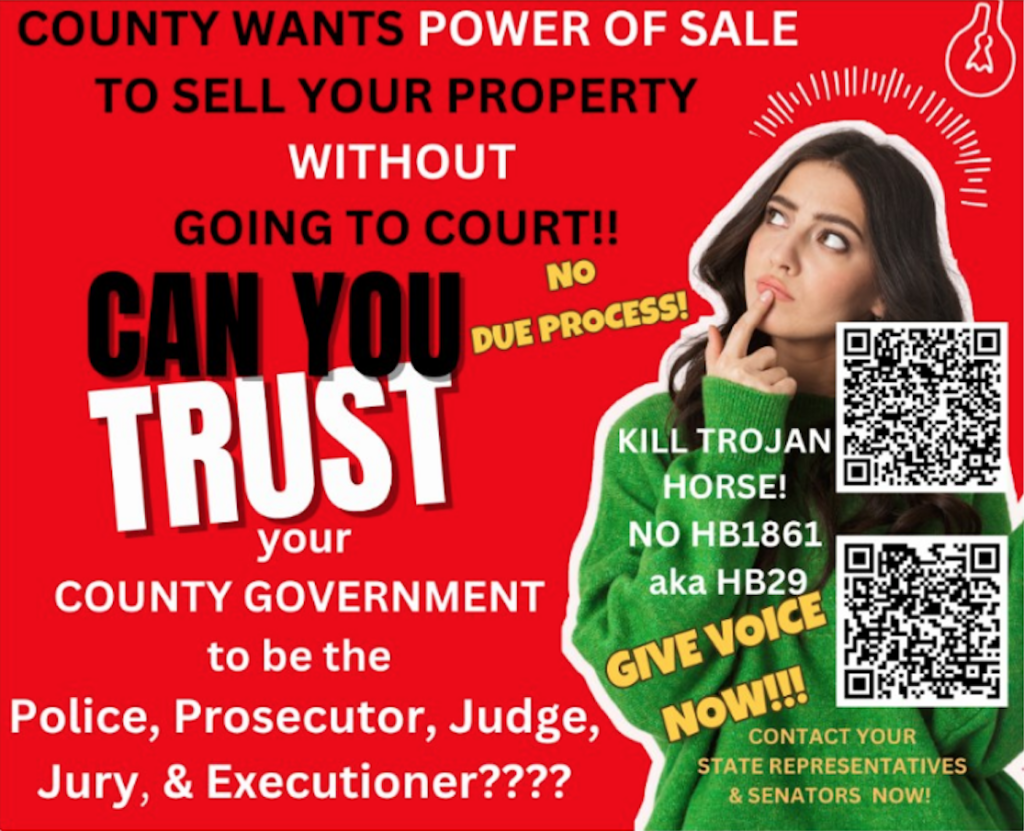 But with this new POWER OF SALE HB29, it’s a forced “taking”. The County wants to sell a private property — based on a County civil fine — WITHOUT going to court. EVERY private property owner becomes a sitting duck.