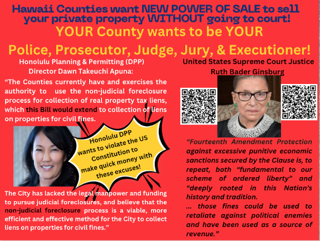 This unconstitutional Tyranny agenda began with Honolulu City County in 2021. The Blangiardi Administration introduced NON-Judicial Power of Sale as a County Legislative Package in 2021. The Department of Planning and Permitting (DPP) gets to issue violations, to place fines and to seize property without no Due Process of going to court.